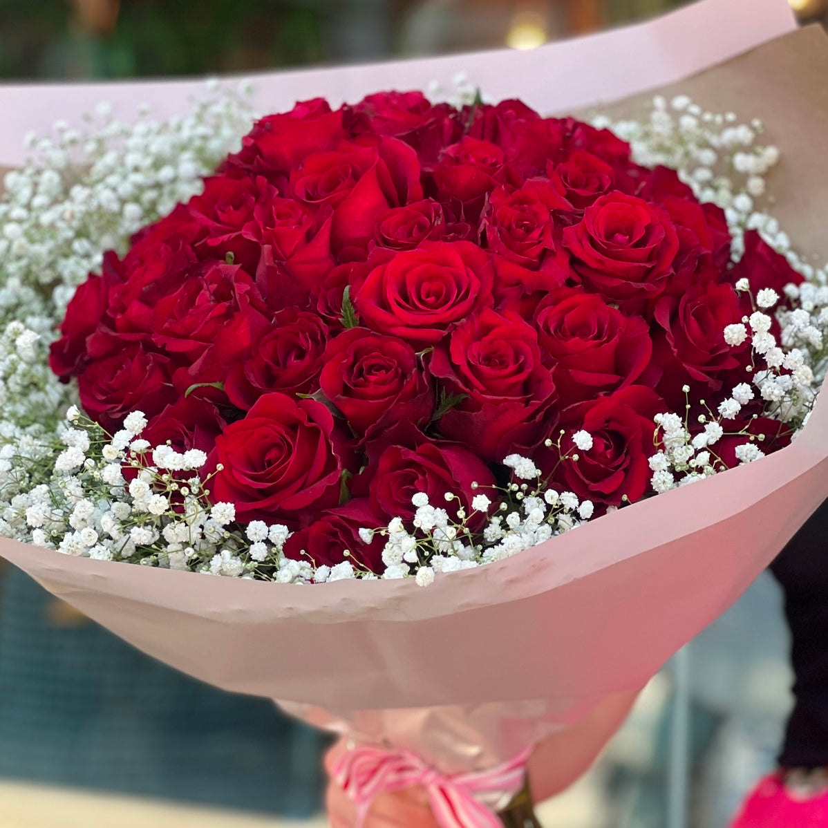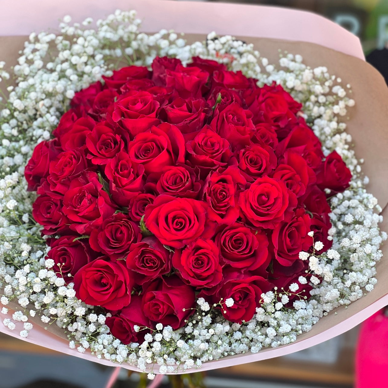 Indulge in a romantic gesture with our "Strawberry Fields 50" bouquet. This stunning arrangement boasts 50 Premium Red Roses and delicate Gypsophila, creating a breathtaking display of love and passion. Perfect for any special occasion. Let your loved one feel the power of your affection with this vibrant and meaningful gift.
